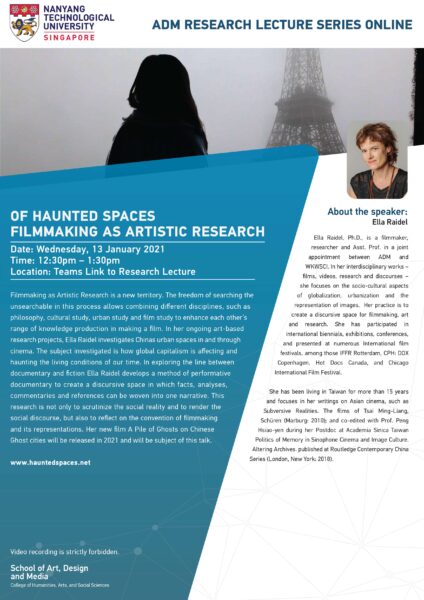 Filmmaking as Artistic Research is new territory. The freedom of searching the unsearchable in this process allows combining different disciplines, such as philosophy, cultural study, urban study, and film study to enhance each other’s range of knowledge production in making a film. In her ongoing art-based research projects, Ella Raidel investigates Chinas urban spaces in and through cinema. The subject investigated is how global capitalism is affecting and haunting the living conditions of our time. In exploring the line between documentary and fiction Ella Raidel develops a method of performative documentary to create a discursive space in which facts, analyses, commentaries, and references can be woven into one narrative. This research is not only to scrutinize the social reality and to render the social discourse, but also to reflect on the convention of filmmaking and its representations. Her new film A Pile of Ghosts on Chinese Ghost cities will be released in 2021 and will be the subject of this talk.